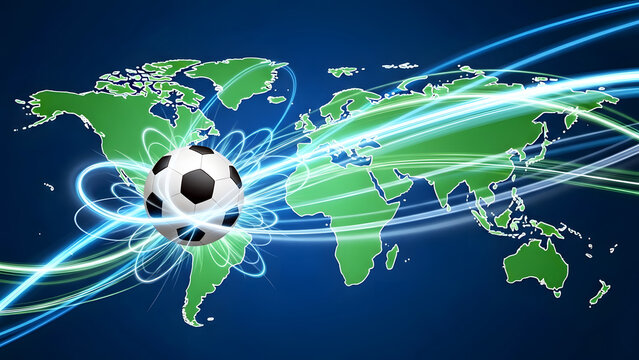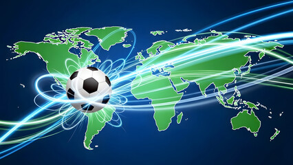 Soccer ball on world map with glowing energy trails symbolizing global sport and connectivity