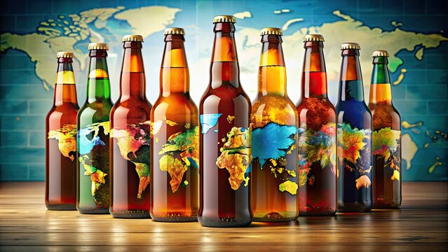 Three bottles of craft beer stand in front of a stylized world map with glowing locations