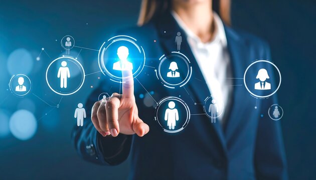 Businesswoman touching virtual screen with social network connection and digital interface