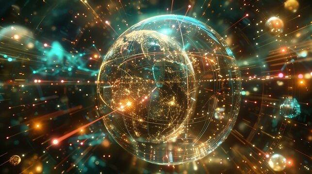 A high-tech global network concept, depicting a semi-transparent sphere with luminous nodes and pathways representing worldwide digital connectivity and communication
