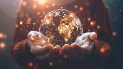 Business professional presenting virtual global communication and service concepts, highlighting connectivity, technology, and client support in a digital era.