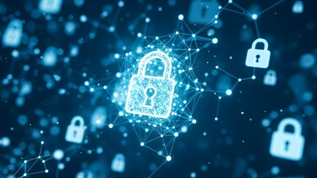 Digital shield with glowing keyhole protecting flowing lines of data and binary code in a futuristic network