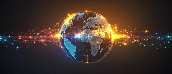 A glowing Earth globe with data transfer paths linking global finance and business trading hubs, illuminated telecommunication lines, futuristic digital design