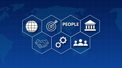 Business concept with icons for people global cooperation and success on a blue world map background Keywords: business, people, global, world map, cooperation, handshake, teamwork, target, goal