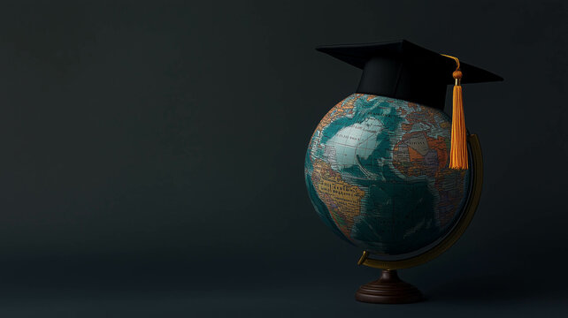 Concept of global business study abroad education. Graduation hat on models globe, books with pencils on wood white background. Congratulations to graduated, Studies lead to success. Back to School