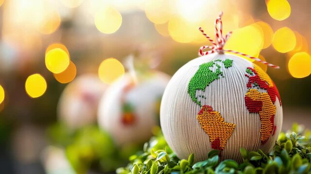 Globe ornament world map holiday decor embroidery with festive bokeh and colorful thread, round bauble and ribbon bow handmade eco friendly craft