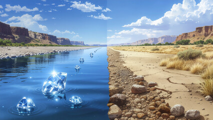Climate change concept showing contrast between abundant water and dry land under blue sky