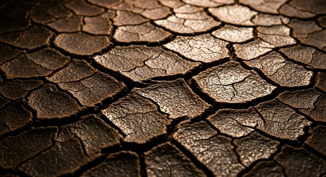 Detailed close-up of deeply cracked dry brown soil texture under dramatic lighting representing drought climate change environmental crisis and arid conditions.