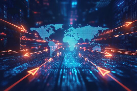 Digital arrows pointing outward from a central point on a world map, representing business expansion into new markets