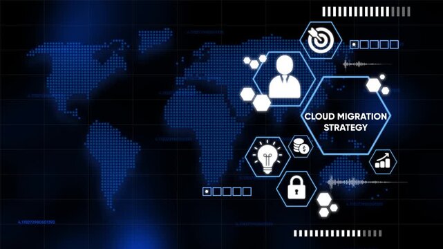 data transfer cloud computing technology concept. There is a large prominent cloud icon in the center with internal connections. and small icon on abstract world map polygon with dark blue background.
