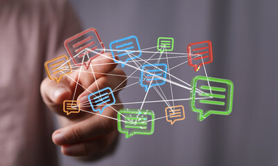 Conceptual image of communication and connection, hand reaching out towards linked message bubbles. Represents global networking, instant messag