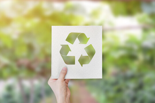 Hand holding cut paper with logo recycle over blur green nature background.