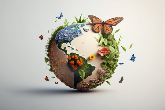 Earth day background with flowers and butterfly, World environment day concept. Generative Ai