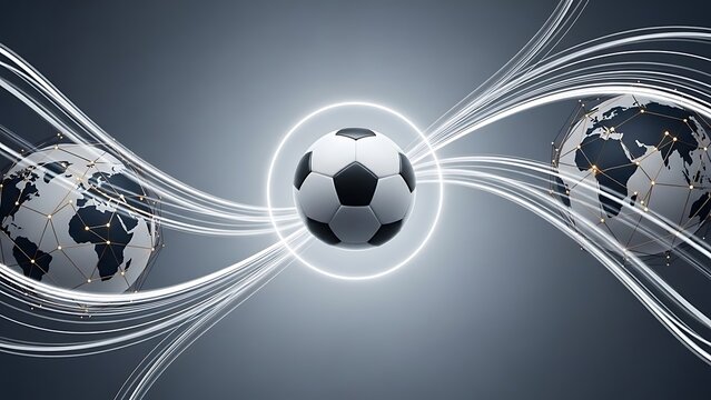 Global soccer concept with a ball centered between glowing light lines and wireframe world globes