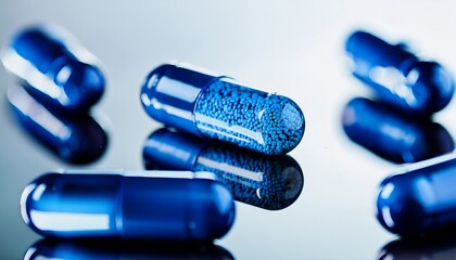 blue capsule pill medicine global health policy image showing scattered pharmaceutical capsule on reflective surface conveying medical care and public wellbeing