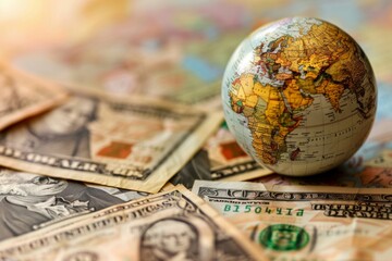 Macro shot of us currency and a miniature globe, representing global financial markets