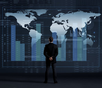 Businessman standing over diagram. World map background. Business, globalization, worldwide concept.