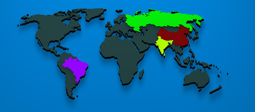 3d map formed by the BRIC countries Brazil, Russia, India and Ch