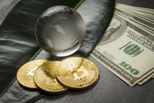 Three gold coins in the form of bitcoin on a table with banknotes and a glass globe