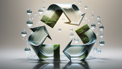 A series of translucent water droplets forming the shape of a recycling symbol, illuminated