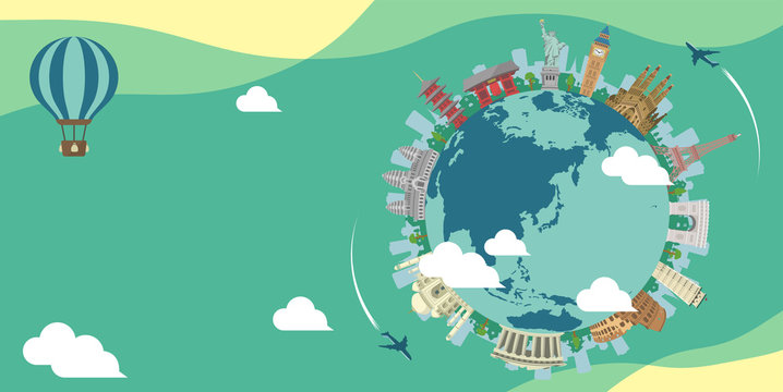 Airplane or plane flying around the globe or planet. Travel, traveling, transportation, earth, aircraft and aeroplane, illustration