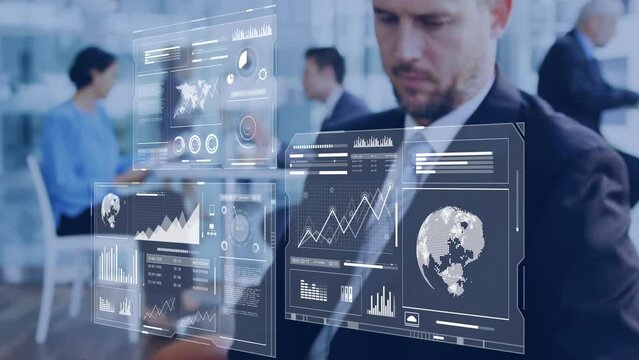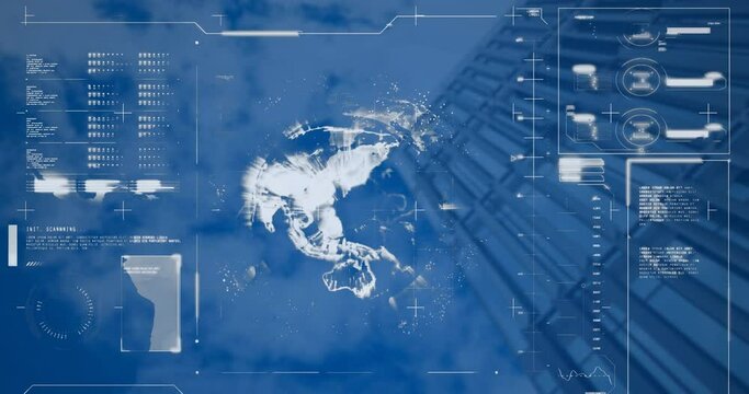 Animation of graphs, loading bars and circles over rotating globe against abstract background
