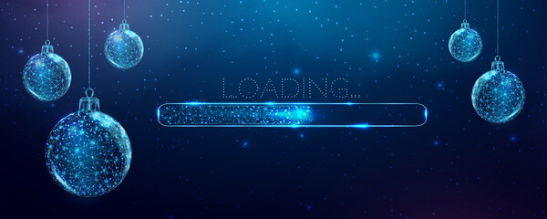 Wireframe Christmas stars and loading bar, low poly style. Merry Christmas and New Year banner. Abstract modern 3d vector illustration on blue background.