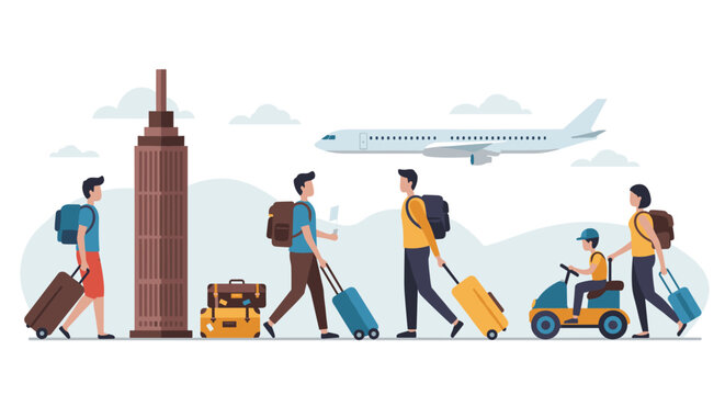 Travelers with luggage and airplane near urban landmark in flat design