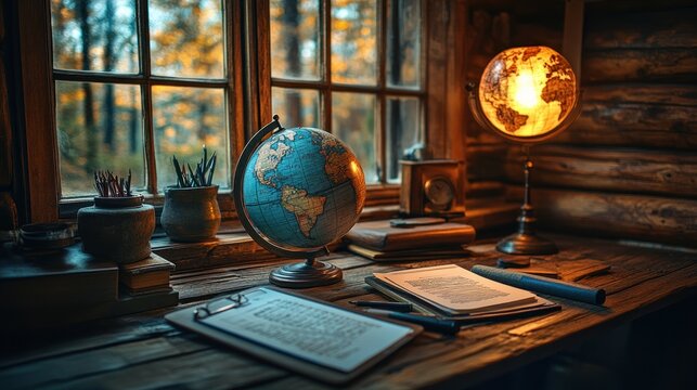 Cozy Cabin Study: Globe, Books, and Autumnal View