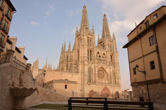 Catedral de Burgos vista desde plaza con fuente y bancos