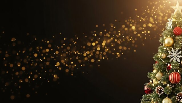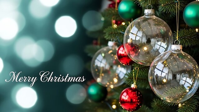 Festive Christmas tree with baubles, ornaments, and blurred bokeh lights