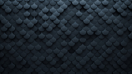 Semigloss, 3D Wall background with tiles. Fish Scale, tile Wallpaper with Black, Polished blocks. 3D Render