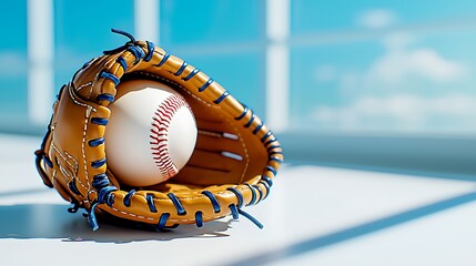 A close-up of a baseball glove cradling a ball against a bright blue sky.