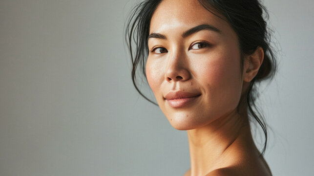 Beautiful Asian woman of middle age posing for beauty portrait. Pretty mature adult lady model from Asia looking at camera smiling on background advertising anti aging skin care. Face skincare .