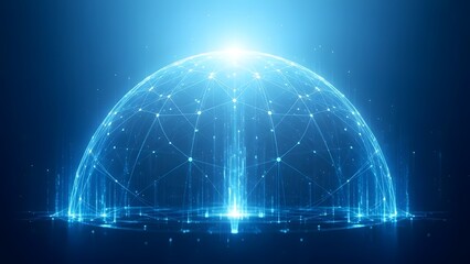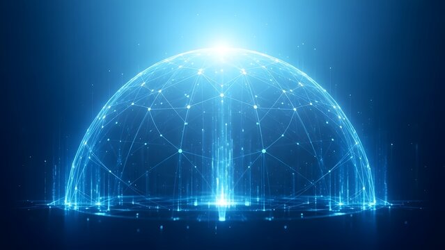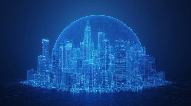 A futuristic cityscape with a glowing blue dome, representing digital transformation and innovation.