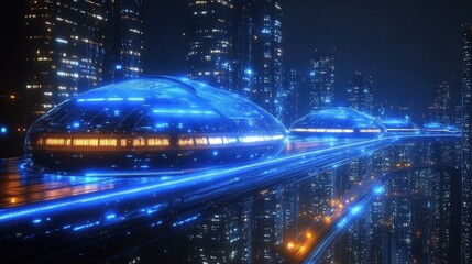 Urban Night Transport. Futuristic cityscape with glowing blue dome structures and high-speed train at night, perfect for technology, innovation, sci-fi backgrounds, urban development, and digital tra