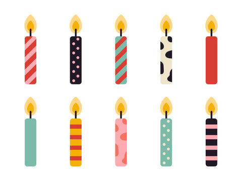 Vector burning birthday cake candles set. Collection of cute candlelights in flat design.