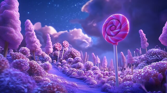 Sweet candy landscape with a glowing purple lollipop centerpiece