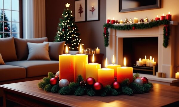 christmas decoration white flowers next to candle on a wooden table. copy space