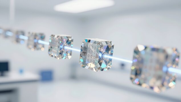 Chain of sparkling faceted diamonds with internal binary code and glowing light beams