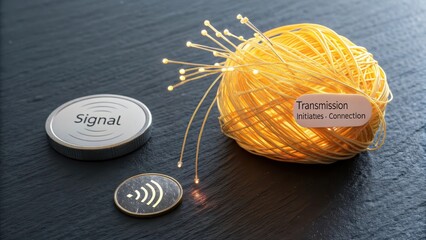 A tightly wound ball of glowing fiber optic strands illuminates next to transmission and signal indicators, representing technological progress.