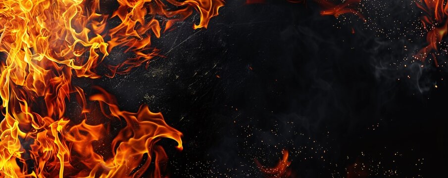 Fiery frames set - corner and line borders made of realistic flames. Burning fire effect, glowing red yellow blaze isolated on black background. Hot hellish inferno danger concept. Blazing banner.