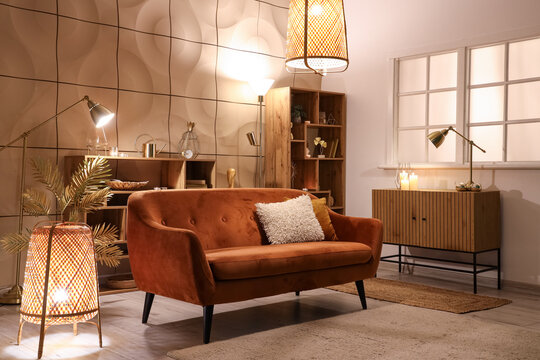 Interior of stylish living room with glowing lamps and sofa at night