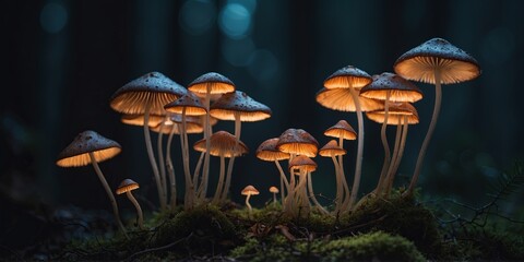 Bioluminescent mushrooms in a dark forest.