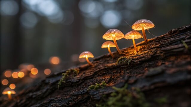 Small glowing mushrooms grow on a mossy log in a dark, enchanting forest, illuminated by warm, magical light.