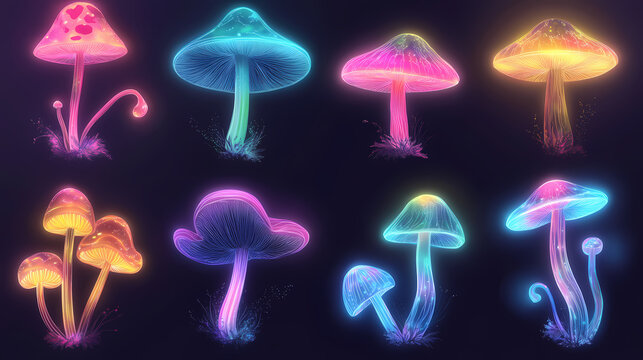 A collection of glowing neon mushrooms in various colors, creating an.. Glowing Mushrooms. Illustration