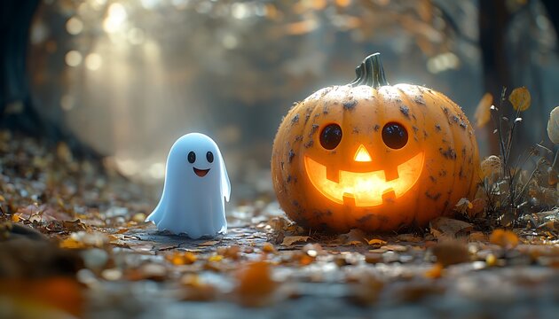 Cute ghost and glowing jack o lantern on autumn forest floor halloween pumpkin