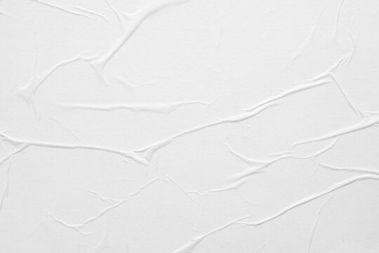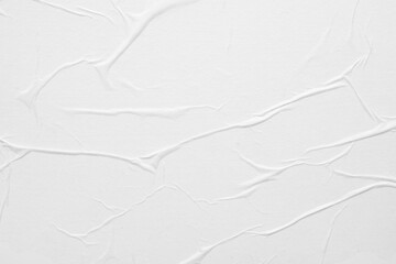 Blank white crumpled paper poster texture background. White paper wrinkled poster template, white paper sticker poster mockup on wall concept