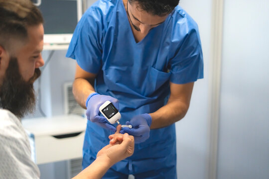 Doctor measuring patient's blood glucose level with glucometer in hospital room