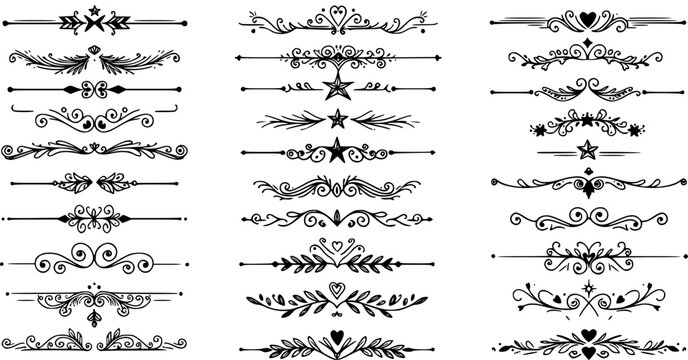 ornamental text divider, elegant border design elements, perfect for web, page decoration, invitations, cards. Vintage style, monochromatic, vector set. Unique, intricate swirls, curls, shapes